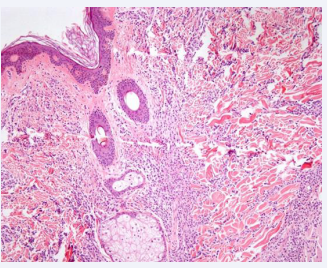 A 44-year-old female patient with medical history of hypothyroidism and diabetes mellitus presented with skin lesions that had evolved over 3 months, initially appearing as papules in the submammary region and subsequently spread accompanied by sporadic itching and pain. Additionally, she reported unquantified weight loss over the past 6 months and painful cervical lymphadenopathy.