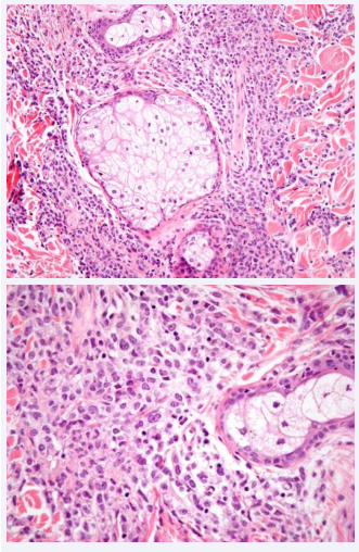 Figure 2: Normal epidermis, well-defined Grenz zone. The superficial and deep dermis is extensively infiltrated by neoplastic cells of hematolymphoid lineage, surrounding the cutaneous appendages. These cells vary in size, with some exhibiting plasmacytoid features extending into the subcutaneous tissue.