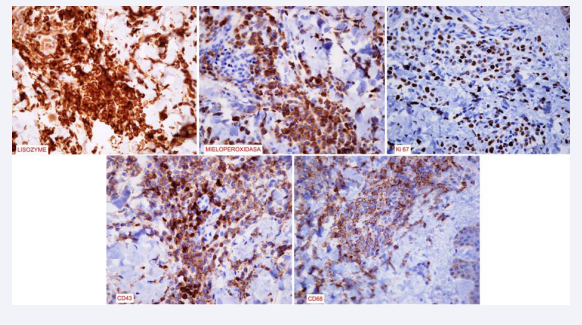 Figure 4: Immunohistochemistry positive for lysozyme, myeloperoxidase, Ki67, CD43, and CD68.