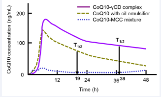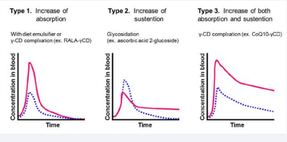 • In comparison with the above two approaches, the inclusion complex formation of hydrophobic substances with γ-CD functions to both enhance Cmax and prolong T1/2 and therefore gives the highest AUC (Type 3). The CoQ10- γCD complex belongs to this approach (Type 3).