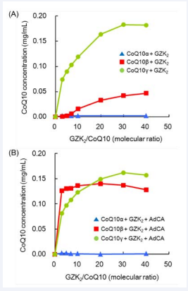 1-Adamantane carboxylic acid (AdCA) is known to have an extremely high association constant with β-CD as well as a high association constant between GZK2 and γ-CD [18]. Therefore, we evaluated the effect of AdCA on the water-solubility changes of CoQ10 by the combination of three natural CD complexes with GZK2 [13,14]. As shown in Figure (7B), a significant increase in the CoQ10 solubility was observed by the addition of AdCA to the CoQ10β with GZK2 , with almost the same CoQ10 solubility increase observed when the γ-CD complex is combined with GZK2 . We believe that this observation supports our mechanism, in which, initially a GZK2 -γCD complex or AdCA-βCD complex is formed followed by CoQ10 molecular captured micelle formation with GZK2 .