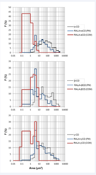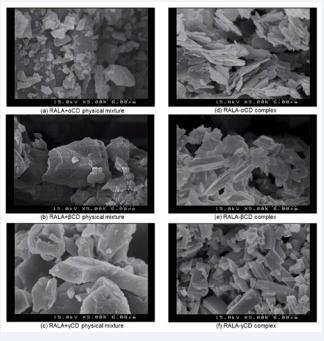 RALA+CD physical mixtures contain particles that appear cracked and wrinkled, and shapes that are uneven and particle sizes that vary considerably in the physical mixtures with the maximum RALA+CD physical mixture particle size exceeding 50μm. There was no considerable change observed between the physical mixtures with RALA in SEM analysis. In contrast, the particle size distribution of RALA-αCD, RALA-βCD and RALA-γCD complexes appeared to be more homogenous than in the RALA+CD physical mixtures (Figure 10). Particles of RALA-CD complexes form larger aggregates that appear to stack.
