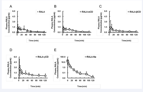 Figure 11: Plasma concentration-time profiles of RALA after oral administration of RALA (A), RALA-αCD complex (B), RALA-βCD complex (C) and RALA-γCD complex (D) and after intravenous administration of RALA sodium salt (RALA-Na) (E) to rats. Data are shown as mean ± S.D. (n = 6).