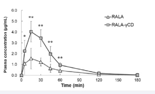 Although there were no significant differences in the Cmax and time to reach maximum plasma concentration (Tmax) among the groups after oral administration, the AUC0-t of RALA after administration of the RALA-γCD complex sample was higher than that of the other complexes (p <0.05, (Table 2)).