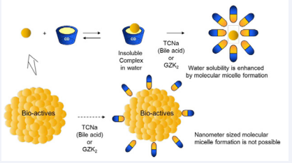 On the other hand, this new nanotechnology (“nanometer molecular captured micelle formation” by the combination of TCNa (bile acid) or GZK2 with γ-CD complexes of bioactives) is a completely different approach from the preparation of nanoparticles starting from a single molecular capsule, a nanometer host-guest complex. The addition of TCNa or GZK2 to the water suspensions of lipophilic bioactives does not help solubilize them because of their sizable and visual particle formation characteristics in water. However, bioactives can be complexed with γ-CD for molecular separation, which leads to the formation of nanometer molecular captured micelles (Figure 13).