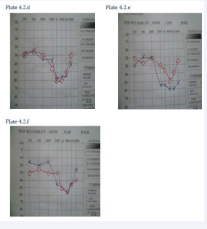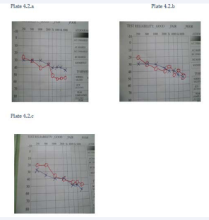 Among the one hundred and forty-five (145) DJ’s enrolled in the study, ninety-eight (98) (representing 67.6%), failed the screening test and the remaining forty-seven (47) (representing 32.4%), passed bilaterally. Of the ninety-eight (98) who failed, sixty-four (64) (representing 65.3%), had NIHL and the remaining thirty-four (34) (representing 34.7%) had normal or mild to moderate losses in mainly one ear as shown in audiograms; Plate 4.2.a, Plate 4.2.b, Plate 4.2.c. This they said was the case because they would usually wear their headphones on just one ear and free the other ear. So in some cases, the study participants could tell which ear was the better one and which ear was not. In any case, the other ear failed too.