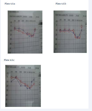 A striking and salient observation made by the researcher which indicates that even though a larger number of the study participants passed the test, (173 representing 60.1%), they might still be at risk of some hearing loss in the near future as shown in Plate 4.3.a, Plate 4.3.b, Plate 4.3.c.