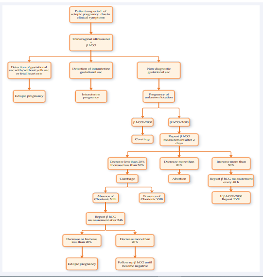 A study conducted by Seeber BE et al. [21] posited that first step of EP recognition was to exclude intrauterine pregnancy. Transvaginal ultrasound can identify IUT for gestational ages greater than 5, 1⁄2 weeks but different sites of EP can complicate the recognition process. In cases with low accuracy of TVUS, β HCG measurement was to be used as surrogate for EP detection. In the absence of intrauterine pregnancy and β hCG measurement above the discriminatory zone, it was recommended to evacuate the uterus to recognize spontaneous abortion from ectopic pregnancy. Following evacuation of the uterus, in the absence of chorionic villi, EP treatment was to commence. In case of nondiagnosis in evacuating the uterus, β hCG measurement was to be repeated after 12-24 hours. For patients with β hCG levels below the discriminatory zone, they suggested either a growing pregnancy (early pregnancy age) or nonviable pregnancy. To confirm a viable pregnancy, the patient was to be followed up with serial β hCG. If the rise or decline of β hCG was not appropriate, it was considered nonviable pregnancy and for patients with level of β hCG greater than discriminatory zone, TVUS was to be administered to detect the presence or absence of intrauterine pregnancy. The strength of this article was that it showed the increase or decrease of β hCG measure as a factor in the recognition of ectopic pregnancy.
