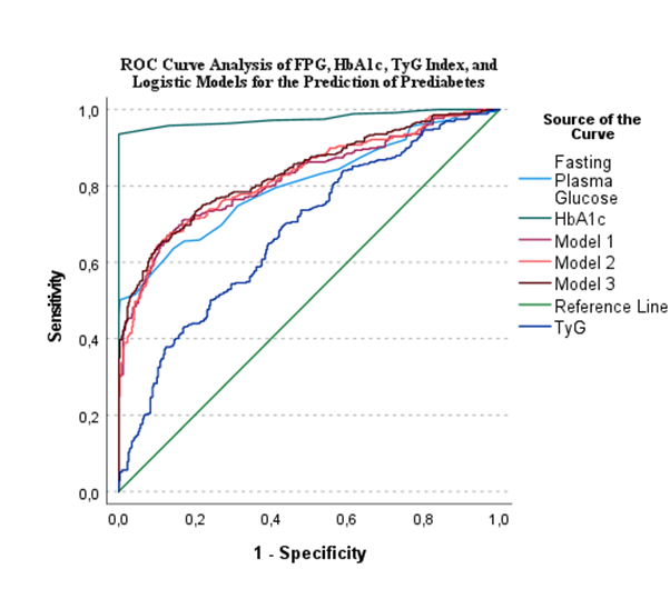 Receiver Operating Characteristic (ROC) analysis was used to evaluate test performance, including Area Under The Curve (AUC), sensitivity, specificity, and optimal cutoff points, determined using the Youden index and Kolmogorov Smirnov statistic. A three-step logistic regression model was constructed to assess predictors of prediabetes. Model 1 included fasting glucose and TyG index; Model 2 added age and sex; and Model 3 further incorporated lifestyle and clinical variables. For all models, Odds Ratios (OR), 95%Confidence ?ntervals (CI), and p-values were reported. Model fit was assessed using the Hosmer–Lemeshow test, Cox & Snell R², and Nagelkerke R² values. Multicollinearity was evaluated using Variance ?nflation Factor (VIF) and tolerance values. A two tailed p-value < 0.05 was considered statistically significant.