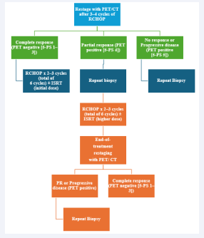distinguishing between stages I/ II (excluding stage II with extensive mesenteric disease) and advanced stages, including stage II with extensive mesenteric disease, stage III, and stage IV. For patients with stage I/II disease, interim PET is performed after three to four cycles of R-CHOP, with three possible response outcomes: complete response, progressive disease, and partial response. Patients in partial response, defined by positive interim PET with a DS of 4, are recommended to undergo repeat biopsy. If the biopsy is negative, the treatment pathway follows the complete response pathway. No specific recommendation is provided for cases with positive biopsies, but it is implied that continuation with an additional two to three cycles of R-CHOP, with or without ISRT, would be necessary. For advanced stages, including stage II with extensive mesenteric disease, stage III, and stage IV, interim PET is conducted after two to four cycles of R-CHOP. While three response outcomes are possible, the guidelines consolidate complete and partial responses into the same pathway, with progressive disease in a separate pathway. Patients in partial response with a DS of 4 or 5 on interim PET continue therapy until six cycles of R-CHOP are completed. At restaging, if the DS is still 4 or 5, a repeat biopsy is performed. A positive biopsy at this stage confirms refractory disease. For patients with a DS of 4 in advanced stages, brief interval restaging should be considered, as this result may represent either active disease or a post-treatment inflammatory response. The BSH guidelines [24] (figure 3)