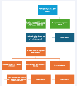 Since the last years of the last century, there has been a need for a standardization of the criteria for response to therapy of non-Hodgkin’ lymphomas (NHL) and Hodgkin’s lymphoma. The first universally accepted response criteria were published in 1999 [1]: these International Working group guidelines defined CR, partial remission (PR), complete remission unconfirmed (CRu), stable disease (SD), relapsed disease, and progressive disease (PD) based on physical examination , chest X-ray , computed tomography (CT) scan, single photon emission computed tomography gallium scans and visual bone marrow evaluation. In 2007, the availability of positron emission tomography (PET), immunochemistry and flow cytometry of the bone marrow, resulted in the revised guidelines [2]. Further experiences with the interpretation of PET scan results subsequently led to Lugano Classification for staging and response assessment incorporating PET CT as a standard component of both the staging and response assessment of FDG-avid histologies as Hodgkin’s disease, follicular lymphoma and large b-cell lymphoma (LBCL) [3]. One aim of these standardizations was a better interpretation of data and the comparisons of the results among various clinical data, but an accurate pretreatment evaluation and assessment of response are critical to the optimal management of patients with lymphoma. In this writing, therefore, we focus the assessment of response and the consequent decisions on management of patients with LBCL for which it has historically more complex to define: those in partial remission during or at the end of the first line and subsequent treatment.