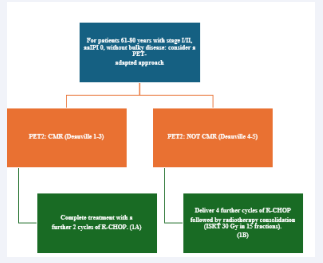 propose a PET-adapted approach specifically for patients aged 61–80 years with stage I/II disease, IPI 0, and no bulky disease. These patients undergo interim PET after two initial cycles of R-CHOP. If a complete metabolic response (CMR) is achieved with a DS of 1–3, treatment is completed with an additional two cycles of R-CHOP. For patients without CMR, defined by a DS of 4 or 5, four additional cycles of R-CHOP are administered, followed by radiotherapy consolidation. A change in treatment is only recommended for patients with no response or progressive disease on interim PET. At the end of treatment, patients with CMR on interim PET generally require only a CT scan for end-of-treatment imaging. For patients without CMR or those who did not undergo interim PET, an end-of-treatment PET-CT scan is recommended, typically three to six weeks after the final dose of antibody. Residual FDG-avid foci warrant biopsy wherever feasible. If biopsy is not possible and imaging findings remain inconclusive, a repeat PET scan after an interval of eight to twelve weeks is advised.
