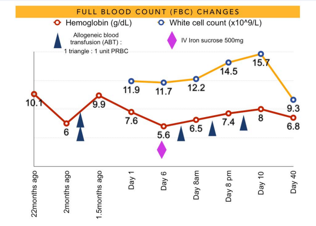 He was diagnosed by our team as having functional iron deficiency (FID) with anemia of chronic illness. Despite the low hemoglobin levels, he did not have symptoms. He was on high protein diet. Prior to this current admission, he had received allogeneic blood transfusion (ABT) to manage his anemia and he had been on oral iron supplement all the time along with other hematinics. During this admission, he was then planned for IV iron to facilitate iron availability for erythropoiesis. However, initial plans for IV Iron infusion was delayed to the following week due to concerns of possible reactions to IV Iron.