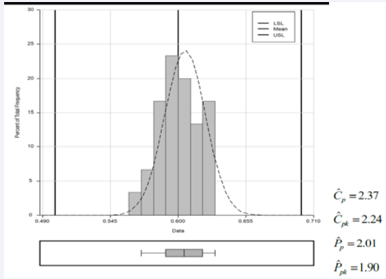 Figure 1 shows a manufacturing process histogram with lower and upper limits. ˆCpk of 2.24 indicates that the process is super, so minimal quality control is required. The ˆCpk index is in agreement with ˆCp , ˆ Pp , and ˆ Ppk favoring a statistically stable process.