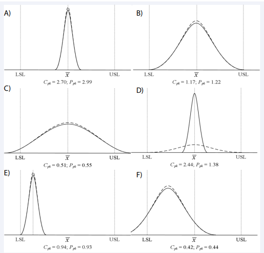 Figure 2-a illustrates a case where the process is super with Cpk and Ppk indexes greater than two. Figure 2-b shows an example of the process with Cpk and Ppk indexes between one and 1.33. Figure 2-c demonstrates the case of a process not capable due to the two lower indexes. Figure 2-d shows an example where according to Cpk the process is classified as super, but according to Ppk, the process is not capable. The difference is due to the standard deviation and general standard deviation computation models. The process should be carefully monitored through control charts and decision rules. Figure 2-e illustrates a case of centerline deviation with data with low variance (similar to the results of Figure 2-a standard deviation) with an insignificant difference between the estimates. Finally, Figure 2-f illustrates the case where the internal and overall standard deviations are close (identical to the estimates in Figure 2-b and less than one. Capability is influenced in this example by a shift in the centerline.