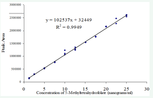 5-MeTHF standard was obtained from Dr. Schirck’s Laboratories (Jona, Switzerland). A stock standard solution of 5- MeTHF was prepared by dissolving five milligrams of 5- MeTHF in 100 ml of 0.1 M sodium acetate containing 10% (w/v) sodium chloride and 1% (w/v) ascorbic acid in a volumetric flask. Working standard solutions of 1.25, 2.5, 5.0, 7.5, 10.0, 12.5, 15.0, 17.5, 22.5, and 25.0 ng/mL were obtained through serial dilution of stock solution. All standard solutions were stored at -18 °C to minimize degradation.