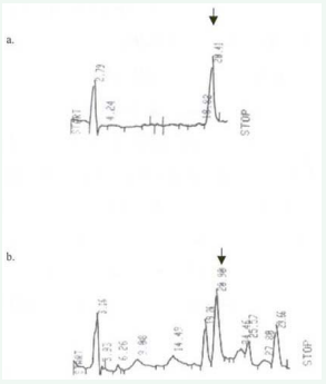 Figure 2: Chromatograms showing: (a) Pure 5- MeTHF standard (27.8 ng/ml, Peak Area 3,585,200) . (b) The same standard taken through the entire folate analytical procedure as food sample had Peak Area 3,687,400.