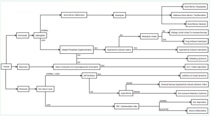 Anemia is a condition marked by a deficiency of red blood cells or of hemoglobin in the blood, resulting in pallor and weariness [1]. It is also known to be one the more common hematological complications of anorexia nervosa with a prevalence of 21-39% [2]. While it is most often due to bone marrow hypoplasia or gelatinous transformation in a malnutrition context [3-5], several other etiologies might be implicated that we should investigate prior to taking care of anorexic patients with anemia. Several studies examine a specific etiology of anemia within anorexic patients, but no systematic review has been conducted in this area. No clear guidelines had been proposed to the eating disorders specialist for the management of anemia within anorexia nervosa patients either. The primary objective of this article is to organize all rare etiologies of anemia within eating disorder patients that we should not overlook. The secondary objective is to propose simple guidelines to follow to help the physician to properly manage anemia within those patients depending on its etiology.