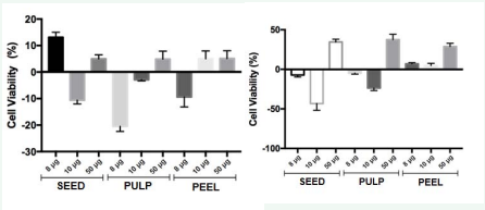 The presence of reducing sugars, alkaloids, anthraquinones, depsides and depsidones, and tannins was identified in the pulp extract. In the peel extract, further to the phytochemicals found in the pulp, the presence of polysaccharides and purines was verified. For the seed extract, in its turn, only the presence of alkaloids and tannins was observed. Alkaloids and anthraquinones, present in the Annonaceae family, have shown significant anti-leishmanicidal activity, as shown by Santos [21]. Another study, performed by Macedo et al. [22], shows that the presence of depsides and depsidones has been recognized as having antitumor properties, and may induce cell cycle arrest and/or tumor cells death by apoptosis. This activity may contribute to the development of numerous effective substances in controlling and treating cancer. Studies point to the antimicrobial action of tannins related to their ability to inactivate microbial adhesins or cell envelope enzyme transport protein, and may also be toxic to filamentous fungi, yeasts and bacteria [23], and this correlation propose A. atemoyaas a likely source of biomolecules with a variety of activities. Considering the benefits presented, it can be said that atemoya probably presents some molecules which are able to aid in the treatment of several diseases. Moreover, it is important to emphasize its integral use, taking into consideration that the peel and the seed present functional features and are culturally wasted parts [24]. The growing consumer interest in healthier products, such as fruit and vegetables, for beneficial effects on health and prevention of chronic diseases is ever increasing. Among these chronic diseases, cancer, whose primary cause is related to oxidative stress [2], can be highlighted. In view of the increased incidence of cancer, several studies with molecules available in nature and found in several foods are performed. However, there are no conclusive studies on atemoya and its correlation with cancer, despite its richness in phytochemical compounds. Nevertheless, constant research is extremely important to know molecules with activities which provide less side effects in cancer treatment, aiding the carrier of the disease. Among the several studies on these molecules, the evaluation of cell viability can be highlighted. To evaluate cell viability, the aqueous extracts (peel, pulp and seed) were used in the test demonstrating the mitochondrial activity of the cell, indicating different possibilities. Among these, the probable cytotoxicity when there is a decrease in viability. The results obtained are shown in Figure 1, Table 2 and Table 3.