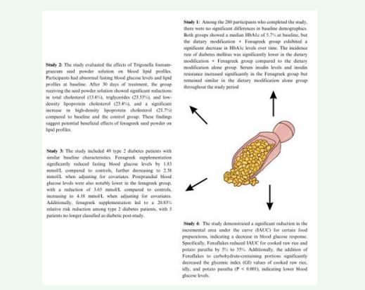 In conclusion, the consistent findings across these studies emphasize the therapeutic potential of fenugreek in managing both diabetes and dyslipidemia. The hypoglycemic effects are primarily due to its soluble fiber and insulinotropic amino acids, while its lipid-lowering effects are attributed to soluble fiber, saponins, and antioxidant compounds. The use of fenugreek, therefore, represents a promising dietary approach to improving metabolic health and reducing the risk of cardiovascular diseases in diabetic individuals. Further research, especially large-scale clinical trials, would be beneficial to confirm these findings and establish standardized guidelines for fenugreek consumption in diabetes management.