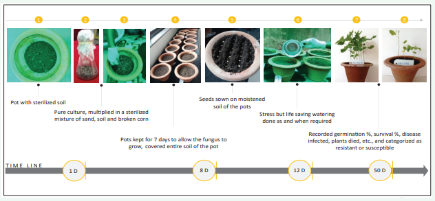 The lab has already developed methods for screening genotypes against charcoal rot. Out of which pot and invivo showed similar responses. So, the experimental trial for estimating the performance of parental genotypes in response to M. phaseolina was set up using earthen pots. A set of earthen pots was raised to screen the genotypes through artificial inoculation. The experiment was conducted in controlled conditions at the Department of plant pathology, Dr PDKV, Akola. The detailed procedure followed is given below (Figure 1).