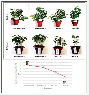 To permit disease development in the potted plants, limited supply of nutrients and water was done. Based on the disease score, 2 genotypes viz., AMS MB 5-19 and AMS MB 5-18 were identified as resistant ones. Similarly, one genotypes NRC 101 was found to be moderately resistant and NRC 127 was found highly susceptible (Figure 3).