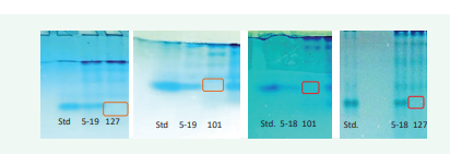 The parental seeds were checked biochemically through NATIVE PAGE for confirming the absence of KTI polypeptides. The samples were loaded in NATIVE PAGE gel and it has been observed that the bands similar to KTI standard were present in genotypes AMS MB 5-18 and AMS MB 5-19 but NRC 101 and NRC 127 does not have. This indicates the absence of KTI allele in donor genotypes NRC 101 and NRC 127 (Figure 4).