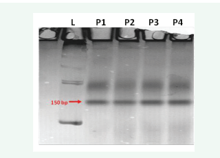 Figure 5: Representative images of polymorphic marker for selected genotypes L- Ladder 100kb, P1 - AMS MB 5-18, P2 =AMS-MB-5-19, P3=NRC-101 and P4=NRC-127
