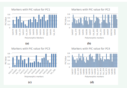 To assess four genotypes, genotyping by SSR marker was scored based on the presence or absence of the bands was used. The data was then organized as discrete variables into a binary matrix, where score ‘1’ denoted the existence of the band and ‘0’ denoted its absence. This data matrix was subsequently subjected to analysis [18]. The polymorphism information content (PIC) for each chromosomal SSR was calculated using the formula to assess the markers’ in formativeness [19].