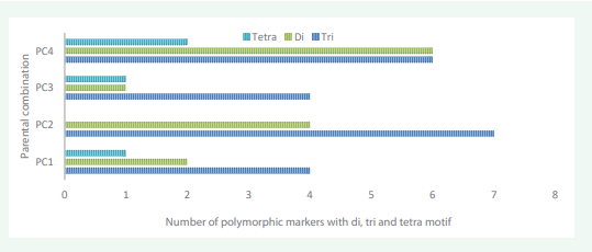 Figure 10: Histogram depicting number of highly polymorphic markers with different number of motifs in different parental combinations