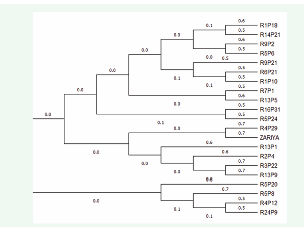 The genetic distances among the twenty-one date palm accessions obtained using UPGMA are represented below. The obtained dendrogram separated the date palm accessions into 6 main Clusters, Based on the clustering, group I consist of four sub clusters representing 19% of the accessions which are R24P9, R4P12, R5P8 and R5P20, Group II also had four sub clusters representing 19% of the accessions which includes the accessions R13P9, R3P22, R2P4, R13P1, Group III , Group IV and Group V had two sub clusters each representing 10% of the total accessions, these accessions includes (ZARIYA, R4P29), (R5P24, R16P31) and (R13P5 and R7P1). Group VI had the highest number of sub clusters with a total number of seven accessions, these represents 33% of the total accessions. These accessions include R1P10, R6P20, R9P12, R15P6, R9P2, R14P21 and R1P18 respectively.