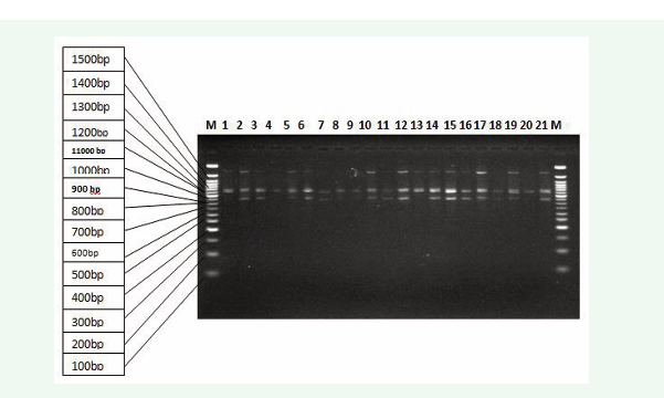 The amplified DNA fragments were separated on 1.5% agarose gel and stained with ethidium bromide. Base pair (bp) DNA ladder (Progma) was used as a Marker within molecular size from 100-1500 bp. Visualized under 300 nm UV light after staining with ethidium bromide.