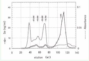 Yamashita, is an organic chemist who synthesized artificial compound troposelenon, a non-benzene type aromatic compound containing selenium (Figure 2), during graduate school. Since she came to the Tokai National Fisheries Research Laboratory, selecting bluefin tuna, which has particularly high selenium content, as a research subject, she analyzed selenium content in various organs and the molecular weight of selenium compounds in the muscle. Tuna caught in offshore fisheries have their gills and internal organs removed on the ship. On the other hand, bluefin tuna caught in set-net fisheries in the Sea of Japan could be obtained with blood and internal organs intact. Analysis of selenium concentration in muscle and organs by fluorescence method with 2,3-diaminonaphthalene showed that the blood contained 15.1 mg/kg of Se. The results showed high concentrations of selenium in kidney (11.7 mg/kg), spleen (10.1 mg/kg), dark muscle (surface 6.7 mg/kg, core 7.4 mg/kg), heart (4.8 mg/kg), gills (2.7 mg/kg), brain (1.6 mg/kg), and ordinary muscle (0. 5 mg/ kg) [1]. Furthermore, when the extract of dark muscle was gel-filtered in the presence of glutathione, molecular weight approximately 50,000 glutathione peroxidase (GPx1), a red selenium compound with molecular weight slightly over 10,000, presumed to be ‘selenium-bound myoglobin,’ and unknown low-molecular-weight selenium of less than 1,300 were found (Figure 3). At that time, it was already known that selenium protein W is present in muscle, selenoprotein P in serum, and GPx1 in red blood cells, so it was considered that low-molecular-weight selenium proteins could exist as degradation products of selenoproteins containing selenocysteine.