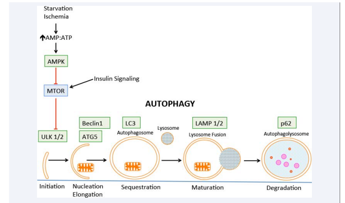 Autophagy is an evolutionarily conserved mechanism to degrade long-lived or damaged proteins and organelles, and is critical for cellular homeostasis. Autophagy occurs constitutively at low levels for routine turnover, and can be up-regulated under conditions of cellular stress, such as hypoxia or starvation, or down-regulated in a well fed state [1,2]. Both up-regulation and down-regulation of autophagy is in part regulated by the insulin signaling pathway via AMPK and MTOR, which suggests that perhaps excessive caloric intake, causes maladaptive autophagy suppression, and contributes to the deleterious effects of key components of metabolic syndrome including obesity and insulin resistance [3]. Autophagy can promote cell survival by generating amino acids from proteins and organelle degradation, or by sequestering damaged mitochondria to prevent stress induced mPTP pore opening and subsequent cell death [4,5]. In the heart, up-regulation of autophagy has been shown to be cardio protective, whereas inhibition of autophagy results in loss of cardio protection, suggesting that autophagy is an integral component to cardiac recovery after an ischemic insult [3]. This observation in animal studies has been confirmed in humans: in patients undergoing coronary artery bypass or valve surgery requiring cardiopulmonary bypass, autophagic flux correlated with cross-clamp time and was inversely related to morbidity and mortality risk scores [6].