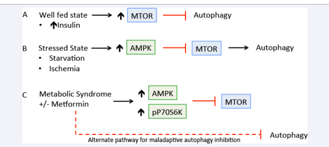 Figure 2 (A) Summary of the effects of a well-fed state on autophagy, (B) stress state on autophagy, and (C) metabolic syndrome on autophagy. MTOR: mammalian target of Rapamycin, AMPK: AMP-activated protein kinase, pP70S6K: phosphorylated S6 ribosomal protein kinase.