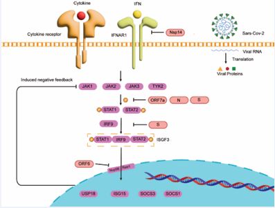 The JAK–STAT pathway serves as a central regulatory hub of immune homeostasis, rapidly linking extracellular cytokine signals to intracellular transcriptional programs that coordinate antimicrobial defense, tissue repair, and metabolic balance. Upon ligand engagement with class II cytokine receptors, members of the JAK family become activated, phosphorylating tyrosine residues on receptor tails and recruiting STAT proteins, which dimerize upon phosphorylation and translocate into the nucleus to regulate target genes [29]. STAT dimers bind GAS or ISRE elements to drive the expression of inflammatory mediators, antiviral effectors, and growth-related genes [30]. Negative regulators—including SOCS proteins, PIAS proteins, and tyrosine phosphatases—constitute feedback systems that constrain signal amplitude and duration [31,32]. Through JAK–STAT activation, interferons induce ISG expression and establish a broad antiviral state; IFN-γ STAT1 activation enhances macrophage microbicidal activity, antigen presentation, and class I MHC expression. Coronaviruses suppress the JAK–STAT pathway through multiple converging mechanisms to gain a replicative advantage during early infection. They delay interferon induction, weaken JAK–STAT activation, and deploy individual viral proteins to directly disrupt signal transduction [33,34]. In SARS-CoV-2, ORF6 binds the interferon-inducible Nup98–Rae1 complex and sequesters it away from the nuclear pore, thereby blocking nucleocytoplasmic transport and preventing STAT1/STAT2 nuclear entry [14-29]. ORF7a inhibits ISGF3 nuclear translocation and selectively suppresses IFN-α–induced STAT2 phosphorylation; it also interacts with HNRNPA2B1 to dampen IFN-triggered JAK STAT signaling [35]. NSP1 binds the ribosome to induce host-mRNA translation shutoff, reducing the protein levels of key signaling factors such as TYK2 and STAT2 and broadly impairing IFN-induced JAK–STAT responses [36]. PLpro suppresses host translation and ISG induction, preventing the onset of an antiviral state [34]. Recent studies show that NSP14 downregulates or degrades IFNAR1, thereby blocking IFN-α/β–mediated JAK–STAT activation and downstream ISG expression [37].