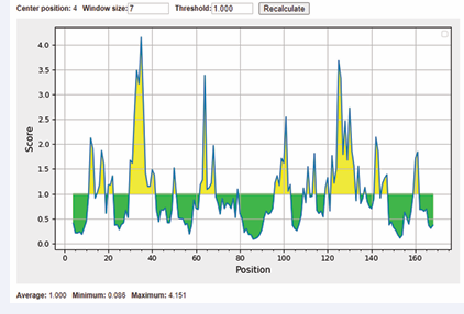 Figure 2: Surface accessible of sequences were showed. The x-axis and y-axis represented the sequence position and surface probability, respectively. The threshold value is 1.000. The regions above the threshold were antigenic, shown in yellow.