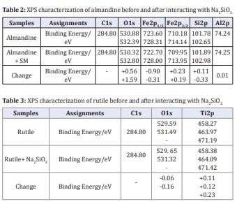To validate the adsorption mechanism of sodium metasilicate on minerals, the XPS analysis test was conducted. The XPS results of the almandine and rutile treated with and without sodium metasilicate are given in [Figure 9-12] as well as [Table 2,3] respectively. The survey spectrum in (Figure 9a,b)