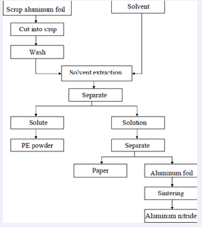 times. The production of aluminum ingots is an energy- consuming industry. It costs about 8 kWh to produce one kilogram of aluminum ingot. To make ingots into aluminum powder or aluminum foil is an energy-consuming industry. However, the nitridation of aluminum must have a huge surface area. Using ready-made scrap aluminum foil, nitridation it into aluminum nitride can save a lot of energy. Even if only solvent filtration separation, the waste aluminum foil separated into aluminum foil, paper, and PE resin, and then aluminum foil pressed into aluminum ingots, can also save a lot of energy. The making of paper is a highly polluted industry, and it also needed cut many trees as raw materials. Get papers from scrap aluminum foil for pulp can avoid of cutting lots of trees. And the making of PE resin is using crude oil as raw material, extracting PE from waste aluminum foil can also reduce crude oil cost.