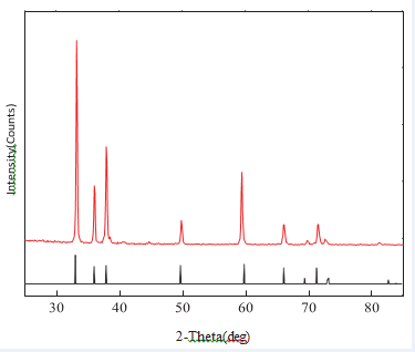 substratenitride powder and the substrate. Diffraction angle at 33°, 36.1 °, 38 °, 50 °, 59 °, 66°, 70°, 72.7°, 73.5° and 82.0° ofthe diffraction peak can be seen same as the JCPDS (09- 0063) standard peak in the bottom. That’s meaning the product has single LiNiO2 layer-rock salt structure, and no impurity phase is produced.