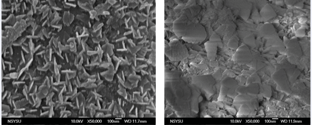Aluminum nitride powder and the substrate crystal structure are analyzed by X-Ray Diffraction Analyzer (RIGAKU Multiflex), using Cu-Kα radiation, wavelength 1.5406 Å, operating voltage is 40 kV, operating current is 30 mA, measuring speed is 3 degree/Min. The 2θ scanning is 15°~ 85°, using JCPDS card as the material identification standard diffraction pattern. X-ray diffraction pattern contains many of crystal structure information, such as the type and size of the unit lattice can be defined by the diffraction peaks of the position (2θ), and the atom structure in the unit lattice can be defined by the relative position of the diffraction peak intensity. Figure 5, 6, respectively, shown the XRD pattern of the aluminum