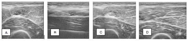 Figure 1 Case 1: Ultrasound images of the right rectus femoris muscle partial tear injury, A. Pretreatment; B. and C. Time of treatment; D. 24 weeks post-treatment.