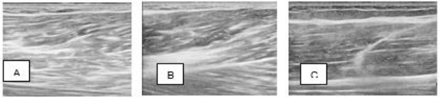 Figure 2 Case 2: Ultrasound images of the right biceps femoris muscle partial tear injury, A. and B. Pretreatment; C. 24 weeks post-treatment.