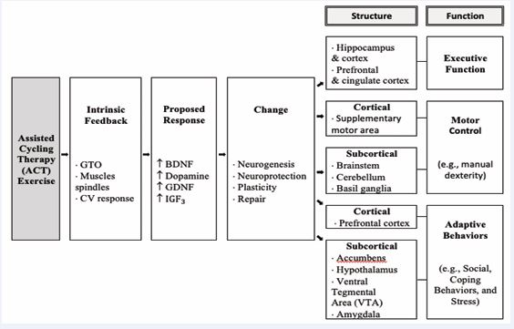 Assisted Cycle Therapy is a mode of aerobic exercise that is enhanced by the use of motorized equipment. The mechanical assistance enables a participant to achieve and maintain an exercise speed that is greater than a preferred self-selected, voluntary speed [33]. ACT has been evaluated in persons with Parkinson’s disease, a progressive neurogenerative disorder resulting in the degeneration of the dopaminergic pathways, and found to enhance motor function above and beyond that of voluntary exercise [33]. Ringenbach [34] have demonstrated similar patterns of improvement in persons with Down syndrome, in addition to improvements in cognitive functioning. As can be seen in Figure 1,