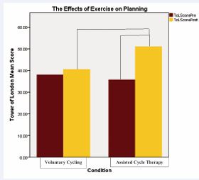 Improvement in the mean score for the Tower of London task was significantly greater in the ACT group compared to the VC group. The observed improvements were insignificant and to a lesser degree in the voluntary exercise group. While there have been no previous studies designed to evaluate the effects of chronic bouts of assisted exercise on these cognitive activation characteristics in ADHD, acute bouts of aerobic exercise have been found to be a significant predictor of better performance as well as facilitate significant change during cognitive planning in typical populations [15,46]. Furthermore, our results are consistent with chronic ACT interventions improving executive function in other populations with prefrontal deficits. The findings of this study are consistent with the research in that there were improvements in reaction time and inhibitory control following 8 weeks of ACT but not Voluntary Cycling in adolescents with DS [47]. For example, improvements in inhibition, cognitive planning and set switching were reported after 20 min acute sessions of ACT but not VC and No Cycling (NC), in adolescents with ASD.