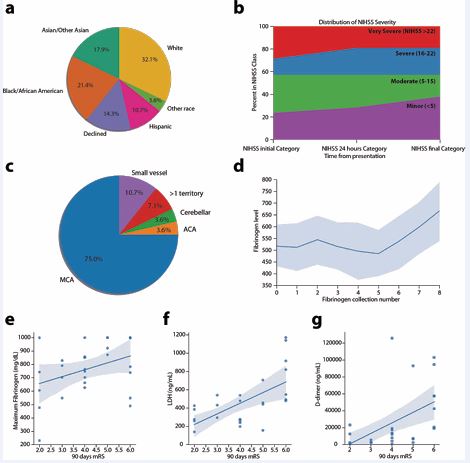 Figure 1 (a) Distribution of patients self or family-reported race upon admission. (b) Initial NIHSS by severity. (c) Distribution of stroke locations. (d) Fibrinogen collections over time with serial collection every 4 hours from stroke symptom onset. (e) Linear regression of maximum fibrinogen level in relation to 90-day mRS. (f) Linear regression of LDH level closest to stroke in relation to 90-day mRS. (g) Linear regression of D-dimer level closest to stroke in relation to 90- day mRS.