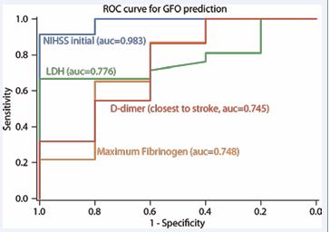 Coagulation markers collection were plotted against NIHSS, stroke volume, and 90-day mRS. Functional outcome classification performance, to independently predict good functional outcome (GFO), defined as mRS 0-2, was visualized using receiver operating characteristics (ROC). Confusion matrices with varying binary classification thresholds for each NIHSS predictor were used to generate ROCs [26]. Variables tested using the ROCs were analysis of initial NIHSS, LDH and D-dimer closest to stroke symptoms onset, and maximal fibrinogen value in relation to 90 day mRS.