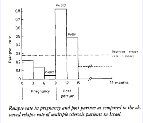 In 1990 a small prospective study of 8 pregnant women with MS was published. 6 of them had relapses after delivery [7].