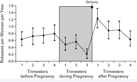 Other retrospective studies were published later on. In 1988, 101 pregnancies of more than 20 weeks were recorded out of a cohort of 52 MS women interviewed by questionnaire. The study showed a significant decrease in relapses in the first and second trimesters, but no increased risk of relapse during the pregnancy period ((9 months of pregnancy and 6 months post partum) [6].