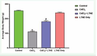 Figure 1 Effects of LTAE on body weight of wistar rats across groups. All data were estimated with the help of one-way ANOVA trailed by Tukey’s multiple comparisons tests. Data were expressed as mean ± S.E.M. β: significant change with respect to control; α: significant change with respect to CdCl2. Value of p < 0.05 was considered significant.